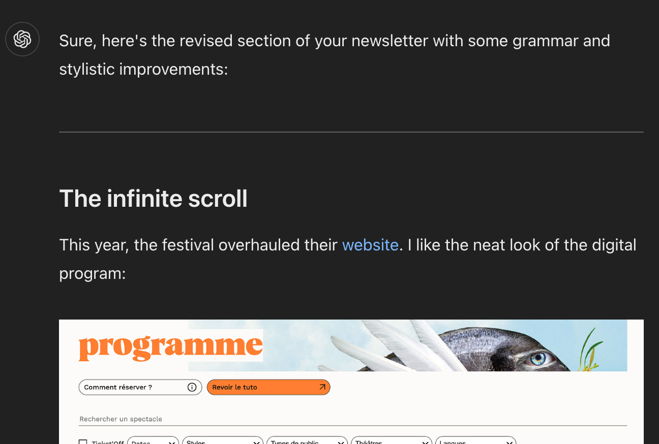 LLMs understand Markdown well so the language review use cases works fine. As a little bonus, ChatGPT renders Markdown output natively, so we get a rich preview of the output.