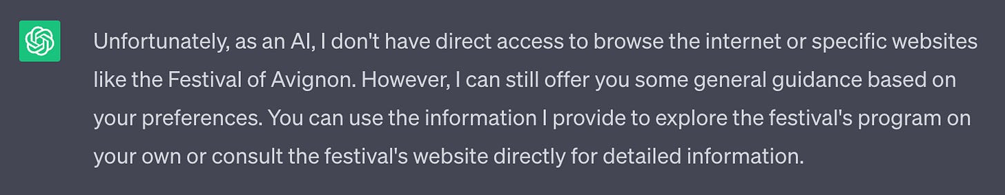 (...) Based on this, can you review the program at https://www.festivaloffavignon.com/ and recommend some shows ?then ChatGPT confesses its limitations: Unfortunately, as an AI, I don't have direct access to browse the internet or specific websites like the Festival of Avignon.